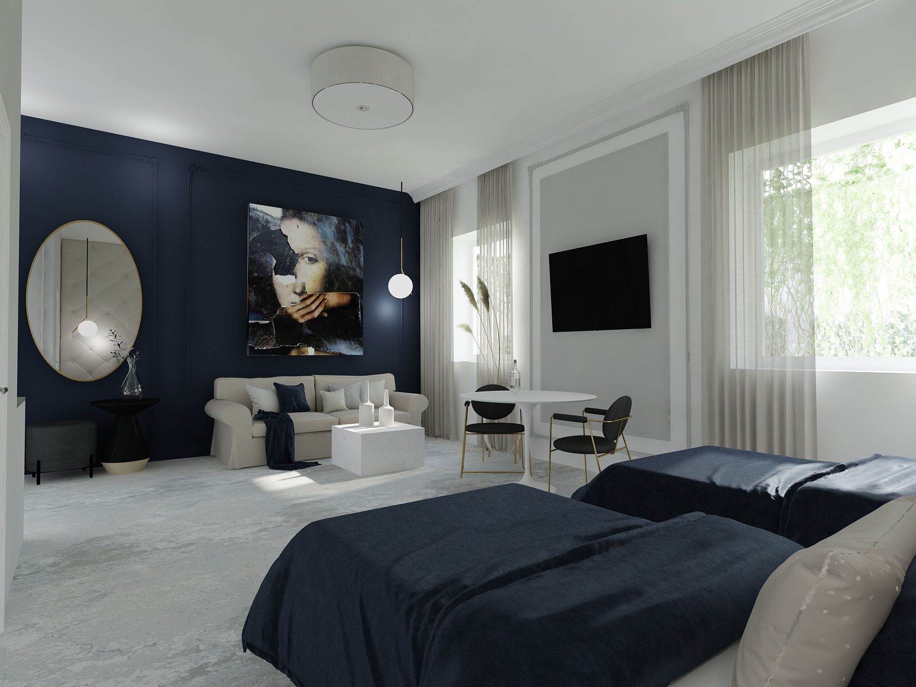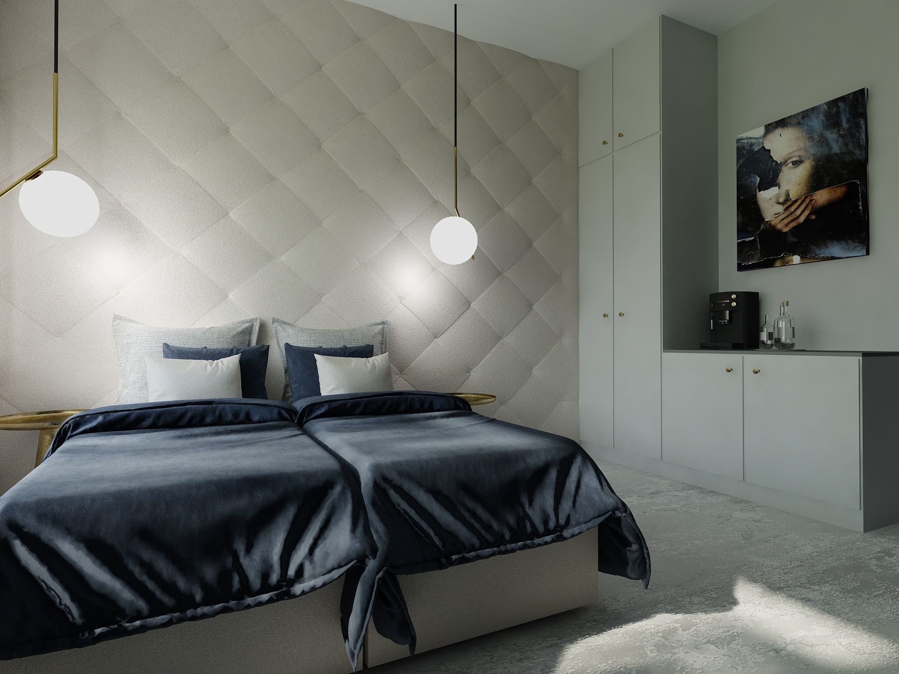 Luksusowy, stylowo wykończony, apartament o powierzchni 70 m2 z podwójnym łóżkiem typu king size (200 cm) w każdej z dwóch przestronnych sypialni, wyposażonymi w materace premium zapewniające komfort wypoczynku. Pomiędzy sypialniami znajduje się łazienka, a obok salonu toaleta z WC. W salonie znajdują się sofa i stolik oraz w pełni wyposażony aneks kuchenny. Klimatyzowany. Do dyspozycji naszych Gości w apartamencie, oprócz wody mineralnej, znajduje się ekspres do kawy z szerokim wyborem kaw w kapsułkach, a w łazienkach dodatkowo szlafroki i pantofle.